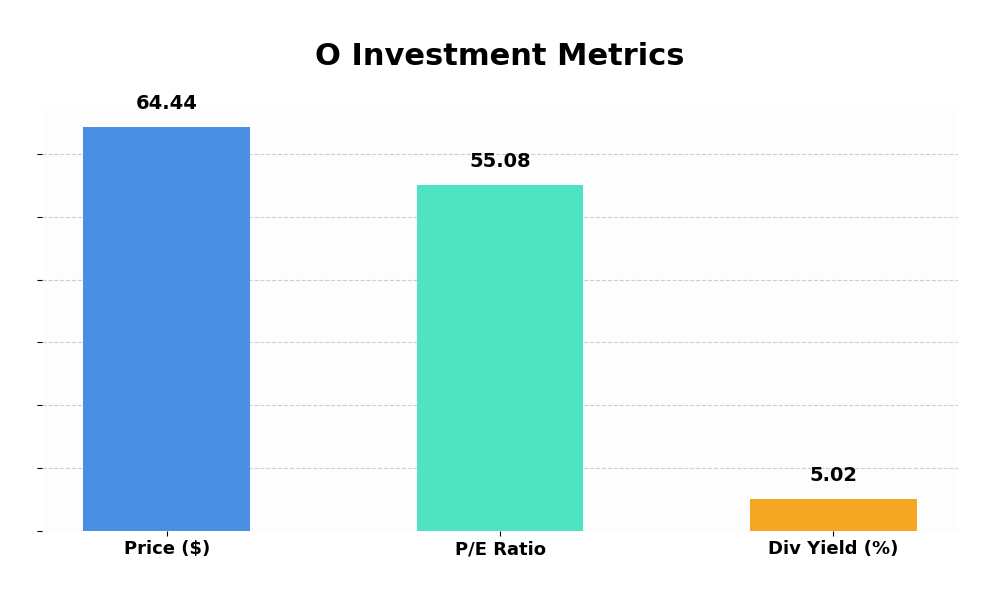 현재 리얼티 인컴의 P/E(주가수익비율)는 55.08로 수치상으로는 다소 높아 보일 수 있습니다. 하지만 리츠(REITs) 분석에서는 일반적인 P/E보다 AFFO(Adjusted Funds From Operations, 조정운영자금)를 기준으로 가치를 평가해야 합니다.